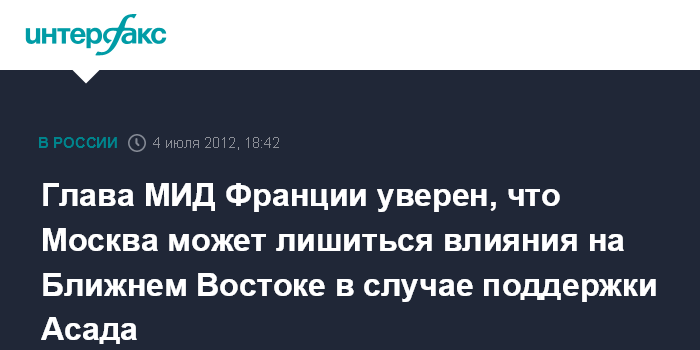 Париж. 4 июля. INTERFAX.RU - Россия может потерять влияние на Ближнем Востоке в случае, если продолжит поддерживать правящий режим президента Сирии Башара Асада, сообщил в среду на пресс-конференции глава МИД Франции Лоран Фабиус.
