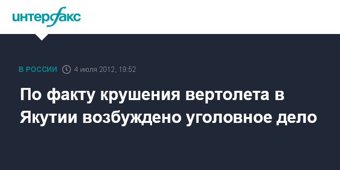 Москва. 4 июля. INTERFAX.RU - Следственные органы возбудили уголовное дело в связи с крушением вертолета авиакомпании "ЮТэйр" в Якутии по статье о нарушении эксплуатации авиасудна. "Уголовное дело возбуждено по факту крушения четырехместного вертолета AS-350 авиакомпании "ЮТэйр", совершавшего перелет по маршруту Братск-Ленск-Толокан", - говорится в сообщении на официальном сайте Следственного комитета РФ.