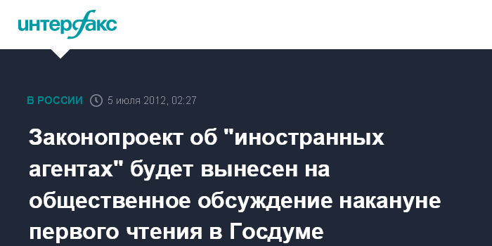 Москва. 5 июля. ИНТЕРФАКС - Законопроект о наделении статусом "иностранный агент" некоторых российских НКО будет обсуждаться в четверг на "круглом столе" "Открытая трибуна".