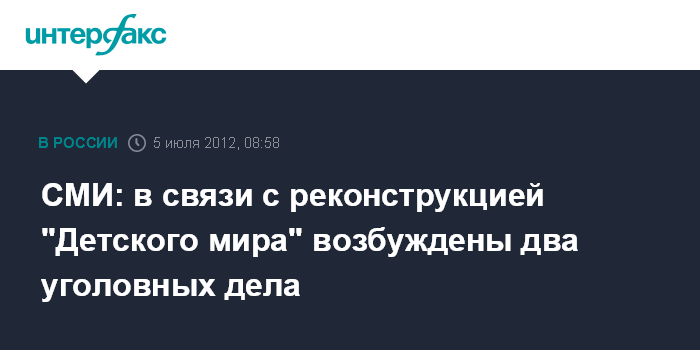 Москва. 5 июля. INTERFAX.RU - СКР и полиция возбудили два уголовных дела, связанных с реконструкцией универмага "Детский мир" (РТС: DTMR) на Лубянке, сообщил "Коммерсант" в четверг.