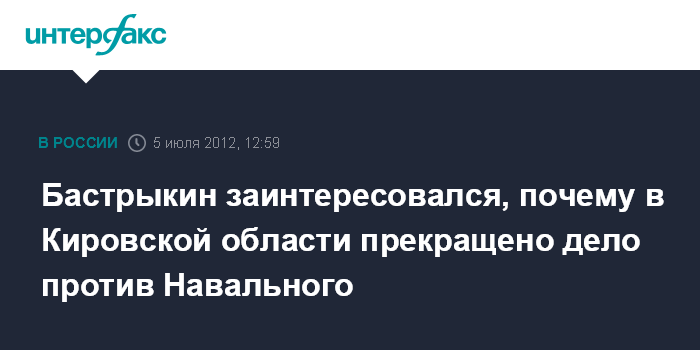 Санкт-Петербург. 5 июля. INTERFAX.RU - Руководитель Следственного комитета Александр Бастрыкин просит пояснить, по какой причине в Кировской области было прекращено уголовное дело против Алексея Навального.