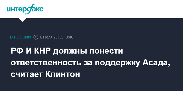 Париж. 6. июля. INTERFAX.RU - Госсекретарь США Хиллари Клинтон в пятницу призвала Россию и Китай прекратить поддерживать режим президента Сирии Башара Асада.