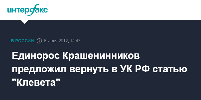 Москва. 6 июля. INTERFAX.RU - Глава думского комитета по законодательству Павел Крашенинников (фракция "Единая Россия") предлагает вернуть в Уголовный кодекс РФ статью "Клевета" и в разы увеличить штрафные санкции, предусмотренные Кодексом об административных правонарушениях (КоАП) за оскорбление.