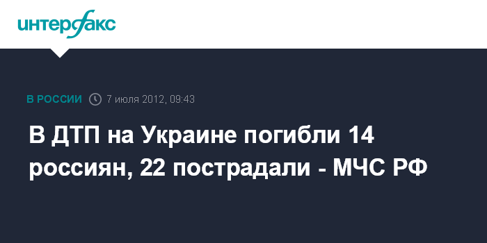 Москва. 7 июля. INTERFAX.RU - Количество пострадавших в результате ДТП с россиянами в Черниговской области Украины возросло до 22 человек, сообщил начальник Национального центра управления в кризисных ситуациях МЧС РФ Владимир Степанов в ходе заседания оперативного штаба по ликвидации последствий ЧС. "В результате ДТП 22 человека пострадали, 14 погибли", - отметил он. В.Степанов также сообщил, что списки погибших и пострадавших будут размещены на сайте МЧС России в течение пяти минут.