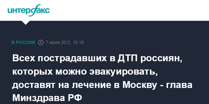 Москва. 7 июля. INTERFAX.RU - Все российские граждане, пострадавшие в ДТП в Черниговской области (Украина), которых можно транспортировать, будут доставлены в Москву в ведущие федеральные медучреждения, сообщила "Интерфаксу" в субботу министр здравоохранения РФ Вероника Скворцова. "Все пострадавшие, состояние которых позволит, будут транспортированы в Москву в ведущие федеральные медицинские учреждения для оказания им специализированной медицинской помощи. В указанных учреждениях уже подготовлены койки для приема пострадавших", - сказала она.