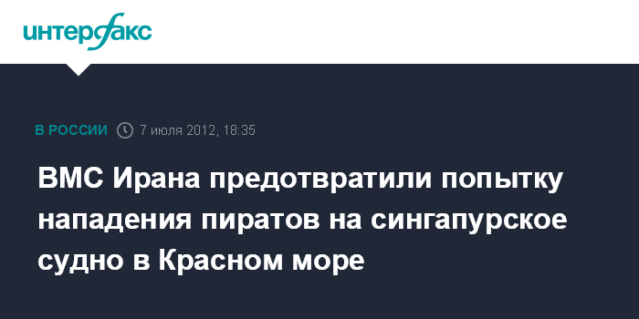 Тегеран. 7 июля. INTERFAX.RU - Корабли ВМС Ирана не позволили сомалийским пиратам захватить торговое судно под флагом Сингапура в Красном море, сообщают в субботу иранские СМИ. По их информации, два пиратских скоростных катера преследовали судно на выходе из Баб-эль-Мандебского пролива между юго-западной оконечностью Аравийского полуострова и Африкой. Экипажи иранских кораблей заметили преследователей и приблизились к ним. После ожесточенной перестрелки пираты ретировались. Сведения о жертвах не поступали.