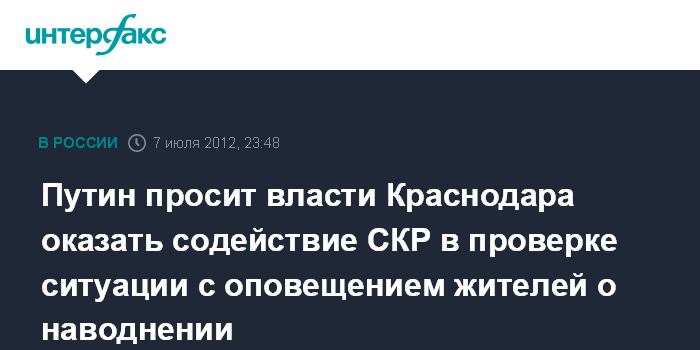 Крымск. 7 июля. ИНТЕРФАКС - Президент РФ Владимир Путин попросил краснодарские власти и, в частности, руководство Крымска оказать содействие Следственному комитету в проверке ситуации с оповещением жителей города о наводнении.