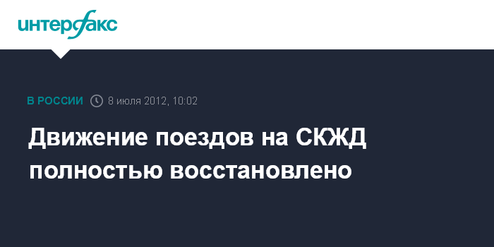 Краснодар. 8 июля. INTERFAX.RU - Движение поездов на Северо-Кавказской железной дороге полностью восстановлено, сообщает пресс-служба СКЖД. "8 июля в 6:10 (мск) было полностью восстановлено движение поездов на Северо-Кавказской железной дороге по направлению на Анапу. Ранее, вечером 7-го июля, было восстановлено движение поездов в направлении на Новороссийск", - говорится в сообщении. В настоящее время ОАО "РЖД" предпринимает все меры для сокращения времени задержки пассажирских поездов.