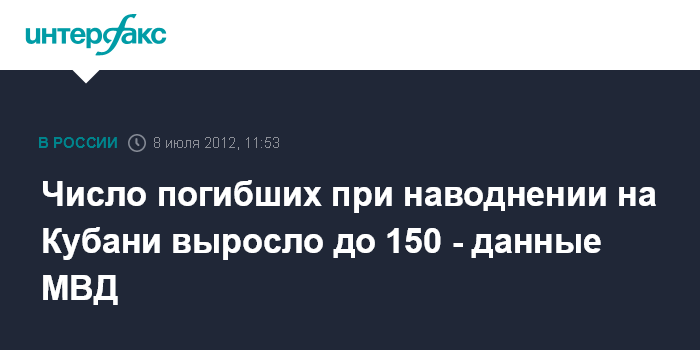 Москва. 8 июля. INTERFAX.RU - Жертвами наводнения в Краснодарском крае стали уже 150 человек, сообщил "Интерфаксу" в воскресенье представитель оперативного штаба при МВД России. "По данным на 11:30 мск обнаружено 150 тел погибших - 139 в Крымске, 9 в Геленджике и 2 в Новороссийске", - сказал собеседник агентства.
