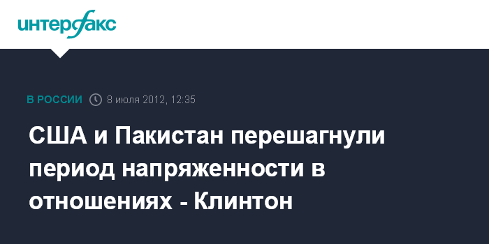 Токио. 8 июля. INTERFAX.RU - США и Пакистан сумели оставить в прошлом период напряженности в отношениях и смотрят в будущее, заявила в воскресенье госсекретарь США Хилари Клинтон. "Мы обе воодушевлены тем, что смогли оставить позади недавние проблемы в отношениях, и можем теперь сфокусироваться на тех вызовах, которые впереди", - сказала она журналистам после встречи в Токио со своей пакистанской коллегой Ниной Раббани Кхар.