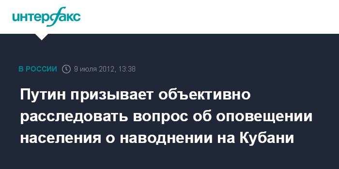 Москва. 9 июля. INTERFAX.RU - Президент России Владимир Путин поручает объективно расследовать, как было организовано на Кубани оповещение о возможном бедствии, определить, как работали все службы.