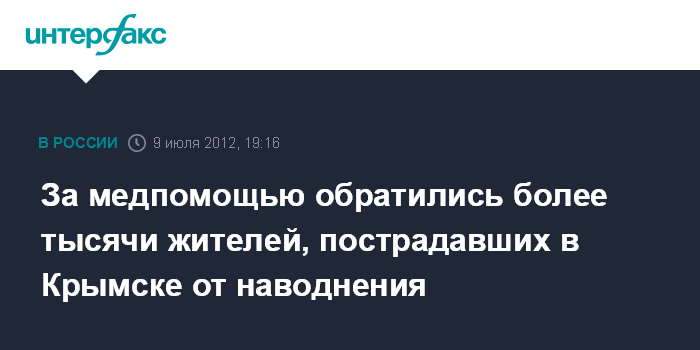 Москва. 9 июля. INTERFAX.RU - Минздрав России сообщает, что за медпомощью после наводнения в Крымске обратилось более тысячи человек.
