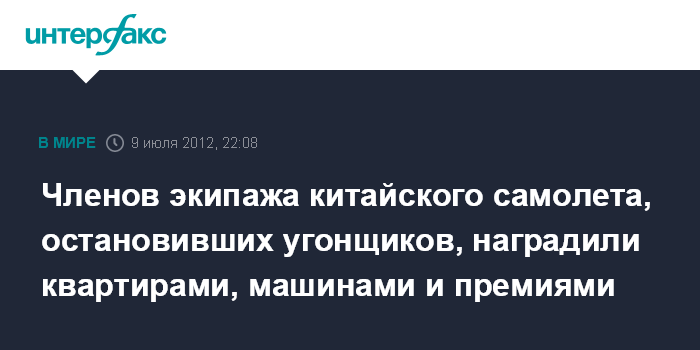 Пекин. 9 июля. INTERFAX.RU - Члены экипажа, предотвратившие угон самолета в Китае, получат щедрое вознаграждение, сообщают в понедельник местные СМИ.