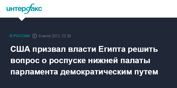 Вашингтон. 10 июля. INTERFAX.RU - Администрация США в понедельник обратилась к руководству Египта с просьбой демократическим путем решить спор по поводу дальнейшей работы нижней палаты парламента.