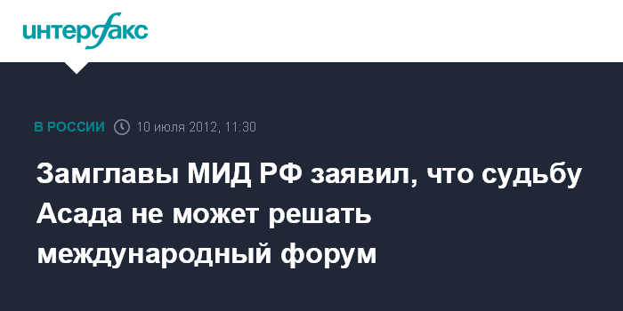 Москва. 10 июля. INTERFAX.RU - Замглавы МИД РФ Михаил Богданов опроверг утверждения о стремлении России сохранить у власти действующего президента Башара Асада, однако подчеркнул, что никакой международный форум не вправе решать судьбу нынешнего сирийского лидера.