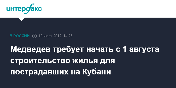 Горки. 10 июля. INTERFAX.RU - Премьер-министр РФ Дмитрий Медведев заявил, что строительство жилья для пострадавших в результате наводнения на Кубани должно начаться с 1 августа, и заявил, что ноябрь является крайним сроком заселения людей в новое жилье.