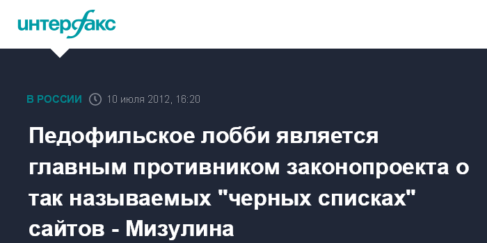 "Само интернет-сообщество инициировало необходимость принятия этого закона, поэтому я убеждена, что не все интернет-сообщество против, а определенные круги, которые можно ассоциировать с педофильским лобби", - заявила "Интерфаксу" Мизулина.