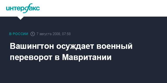 "США осуждают вооруженное свержение демократически избранного правительства Мавритании и приветствуют заявления Африканского союза и Евросоюза, которые также осудили переворот", - говорится в документе. Райс подчеркнула, что "мы выступаем против любых попыток смещения правительств неконституционным путем".