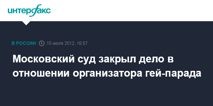 Москва. 10 июля. INTERFAX.RU - Мировой суд Тверского района Москвы признал организатора гей-парада в Москве Николая Алексеева невиновным в участии в несанкционированном гей-параде 27 мая в столице.