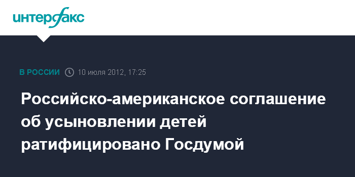 Москва. 10 июля. INTERFAX.RU - Госдума РФ во вторник ратифицировала соглашение между РФ и США об усыновлении детей.