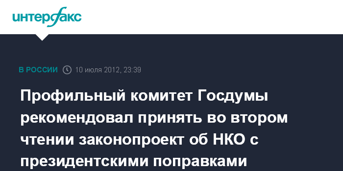 Москва. 10 июля. INTERFAX.RU - Профильный комитет Госдумы рекомендовал принять во втором чтении законопроект об НКО-"иностранных агентах" с учетом предложений президента РФ, поступивших в Госдуму вечером во вторник.