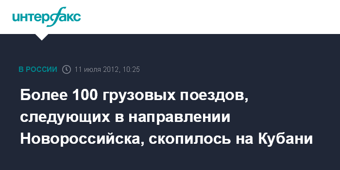 Москва. 11 июля. INTERFAX.RU - Более 100 грузовых составов, следующих на станции новороссийского направления Северо-Кавказской железной дороги (СКЖД), скопилось в связи с произошедшим наводнением на Кубани, сообщила пресс-служба ОАО "Российские железные дороги" (РЖД).
