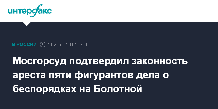 Москва. 11 июля. INTERFAX.RU - Мосгорсуд в среду признал законным арест пяти фигурантов дела о беспорядках на Болотной площади 6 мая.