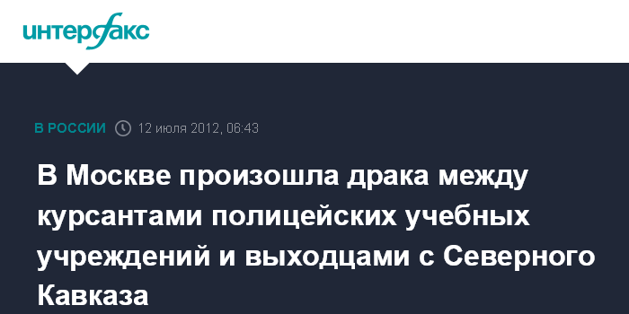 Москва. 12 июля. ИНТЕРФАКС - Драка между будущими полицейскими и выходцами с Северного Кавказа произошла в Москве, сообщил "Интерфаксу" источник в правоохранительных органах.