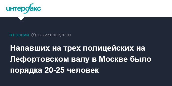 Москва. 12 июля. INTERFAX.RU - В конфликте с тремя полицейскими на Лефортовском валу принимали участие порядка 20-25 человек, сообщили "Интерфаксу" в пресс-службе ГУ МВД России по Москве.