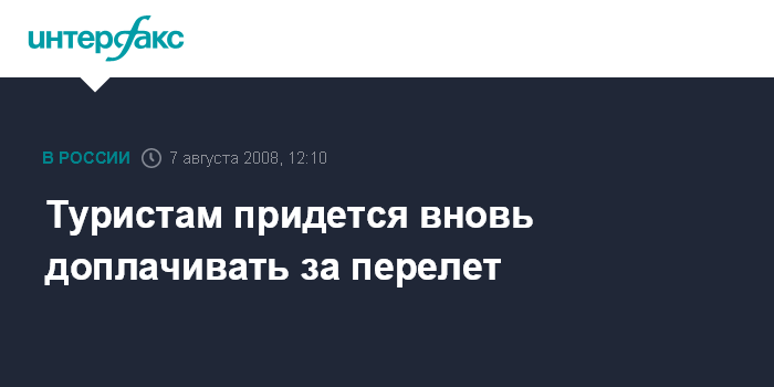 Москва. 7 августа. INTERFAX.RU - На этой неделе туроператоры вновь объявили о введении авиакомпаниями топливного сбора на чартерные и регулярные рейсы по наиболее популярным направлениям отдыха. Аналогичное повышение происходило этим летом уже три раза - в мае, июне и июле.