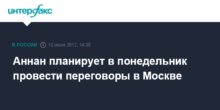 Женева. 13 июля. INTERFAX.RU - Спецпосланник ООН и ЛАГ по Сирии Кофи Аннан планирует в понедельник провести переговоры в Москве с российскими руководителями, сообщил в пятницу его представитель Ахмад Фаузи.