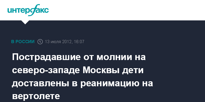 Москва. 13 июля. INTERFAX.RU - Дети, пострадавшие в пятницу в Москве от удара молнии, находятся в реанимации, им оказывается экстренная медицинская помощь, сообщил "Интерфаксу" источник в медицинских кругах.