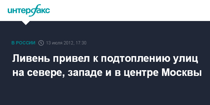 Москва. 13 июля. INTERFAX.RU - Сильный ливень в Москве в пятницу днем привел к скоплению воды на ряде улиц, сообщили "Интерфаксу" в пресс-службе ГУП "Мосводосток". "К нам поступило 16 заявок на скопления воды, три из них не подтвердились. Основная часть заявок - из центра Москвы, а также Западного и Северного округов", - рассказал собеседник агентства.