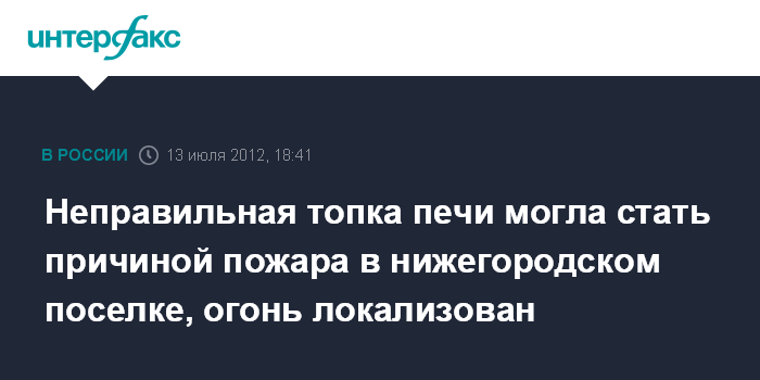 Нижний Новгород. 13 июля. INTERFAX.RU - Предположительной причиной пожара в поселке Рустай Нижегородской области стала перетопка печи в бане, сообщила агентству "Интерфакс-Поволжье" начальник пресс-службы регионального управления МЧС России Светлана Петрова.