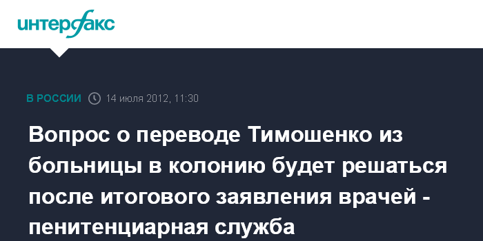 Вопрос о переводе Тимошенко из больницы в колонию будет решаться после итогового заявления врачей - пенитенциарная служба