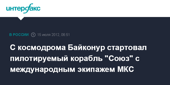 Байконур (Казахстан). 15 июля. ИНТЕРФАКС-АВН - С космодрома Байконур к Международной космической станции в воскресенье в 06:40 мск стартовал пилотируемый корабль "Союз", сообщил корреспондент "Интерфакс-АВН" с места события.