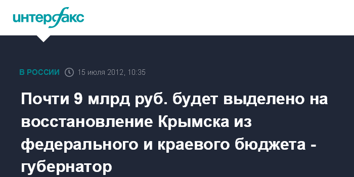 Почти 9 млрд руб. будет выделено на восстановление Крымска из федерального и краевого бюджета - губернатор