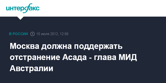 Канберра. 15 июля. INTERFAX.RU - Министр иностранных дел Австралии Боб Карр в воскресенье призвал Россию поддержать смещение Башара Асада с поста президента Сирии. "Президент Асад должен уйти", - заявил Б.Карр, добавив, что настало время, когда "России следует использовать свое влияние на Дамаск и проголосовать за введение всесторонних санкций (в отношении властей Сирии - ИФ) в Совбезе ООН", - заявил журналистам министр иностранных дел Австралии.