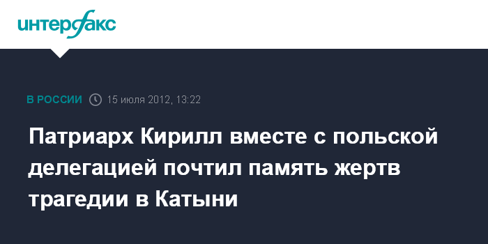 Катынь (Смоленская область). 15 июля. INTERFAX.RU - Патриарх Московский и всея Руси Кирилл в воскресенье совершил заупокойную литию на территории международного мемориала памяти жертвам политических репрессий "Катынь" под Смоленском. Богослужение было совершено при входе, между российской и польской частями мемориала. Затем патриарх и члены польской делегации, в которую входят православные капелланы и военные, возложили цветы к памятникам на обеих частях комплекса.