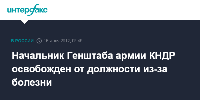 Пхеньян. 16 июля. INTERFAX.RU - Начальник Генштаба армии КНДР Ли Ен Хо, известный как доверенное лицо северокорейского лидера Ким Чен Ына, ушел с поста из-за болезни, сообщает ЦТАК в понедельник.