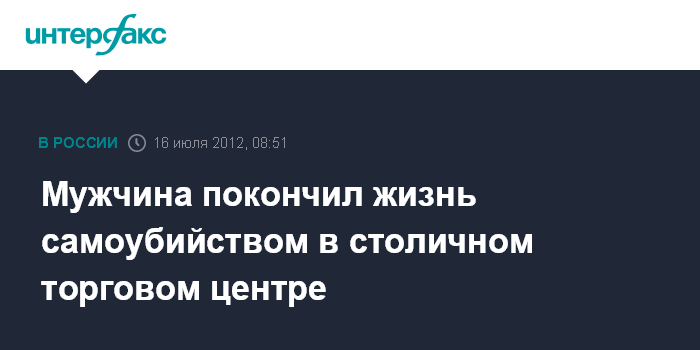 Москва. 16 июля. INTERFAX.RU - Неработающий москвич покончил жизнь самоубийством в туалете торгового центра на севере города, сообщил "Интерфаксу" источник в правоохранительных органах.