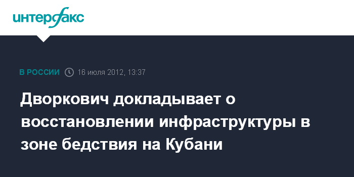 В ходе совещания у премьер-министра РФ Дмитрия Медведева в понедельник А.Дворкович доложил последние, по состоянию на 9:00 мск понедельника, данные по восстановлению инфраструктуры, пострадавшей в результате наводнения на Кубани.