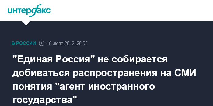 Москва. 16 июля. INTERFAX.RU - В "Единой России" удивлены появившейся инициативой депутата Ильи Костунова о возможности распространения на СМИ понятия "агент иностранного государства".