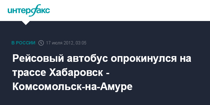 Хабаровск. 17 июля. ИНТЕРФАКС-ДАЛЬНИЙ ВОСТОК - На автодороге Хабаровск - Комсомольск-на-Амуре перевернулся рейсовый автобус с пассажирами, сообщает ГУ МЧС России по Хабаровскому краю во вторник.