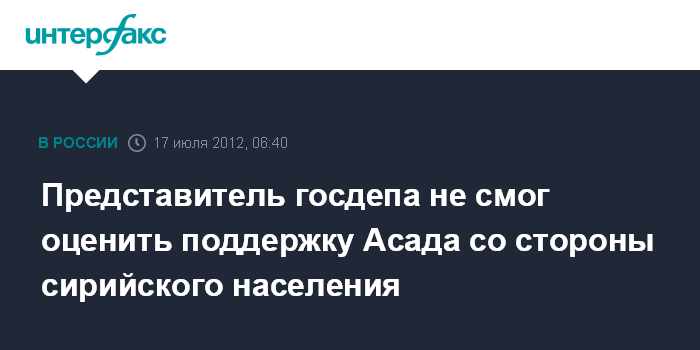 Вашингтон. 17 июля. ИНТЕРФАКС - Официальный представитель госдепартамента США Патрик Вентрелл не смог дать оценку поддержки президента Сирии Башара Асада со стороны части населения Сирии.