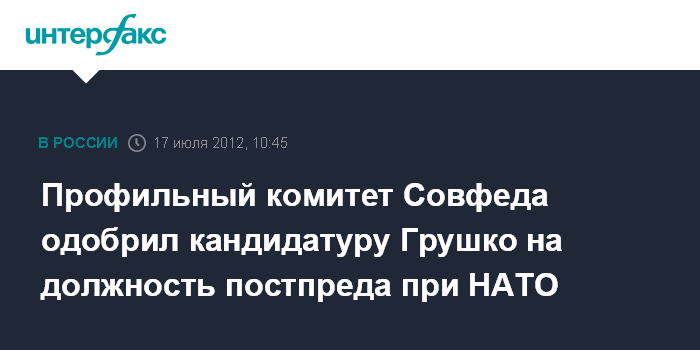 Москва. 17 июля. INTERFAX.RU - Комитет по международным делам Совета Федерации одобрил кандидатуру Александра Грушко постоянным представителем РФ при НАТО.