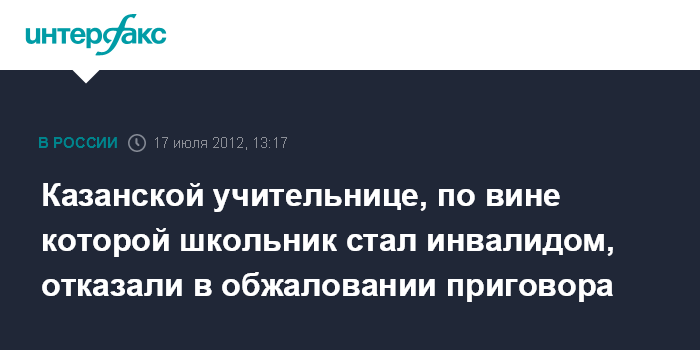 Казань. 17 июля. INTERFAX.RU - Судебная коллегия по уголовным делам Верховного суда Татарстана отказала в удовлетворении кассационной жалобы учительнице начальных классов гимназии N155 Казани Фании Габдуллиной, которая была признана виновной в травмировании 9-летнего школьника.