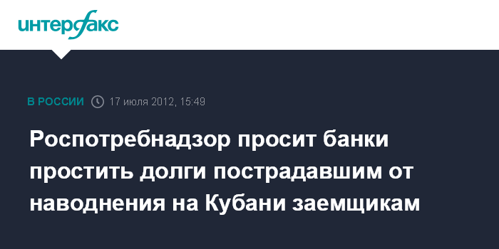 Москва. 17 июля. INTERFAX.RU - Роспотребнадзор предлагает банкам простить долги кредиторам-жителям Краснодарского края, пострадавшим от наводнения.