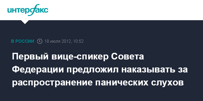 Москва. 18 июля. INTERFAX.RU - Первый вице-спикер Совета Федерации Александр Торшин предлагает подумать о возможности введения ответственности за распространение панических слухов.