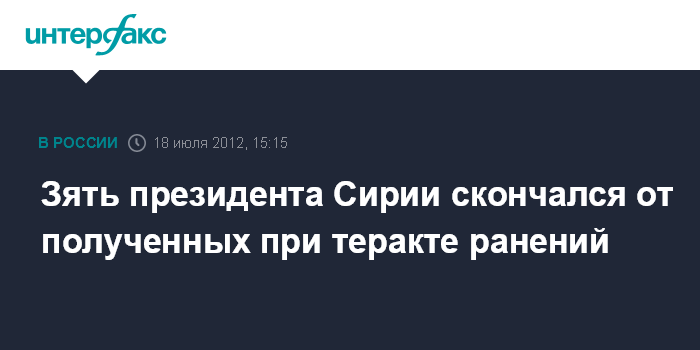 Бейрут. 18 июля. INTERFAX.RU - Глава сирийской военной разведки и зять президента Башара Асада Асиф Шаукат погиб от ранений, полученных в результате взрыва в Дамаске, сообщает в среду ливанский телеканал "Аль-Манар".